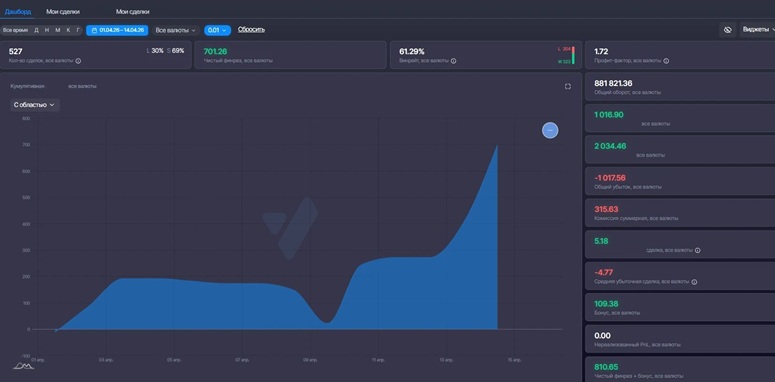 Функция выбора временного периода позволяет гибко настраивать интервал анализа — от отдельных торговых сессий до более длительных отрезков. Это дает возможность оценивать как краткосрочные результаты, так и долгосрочные тенденции, что особенно важно для выявления устойчивости торговой стратегии.