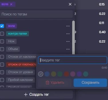 Одним из ключевых элементов дневника является система тегов. Пользователь может выбирать причины входа в сделку из предустановленных пресетов или создавать собственные категории, а также редактировать и удалять их. Теги могут использоваться в качестве фильтра, влияя в том числе на агрегированные показатели в разделе «Итоги по сделкам».